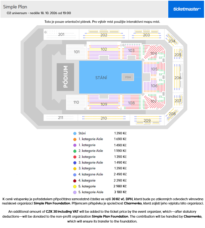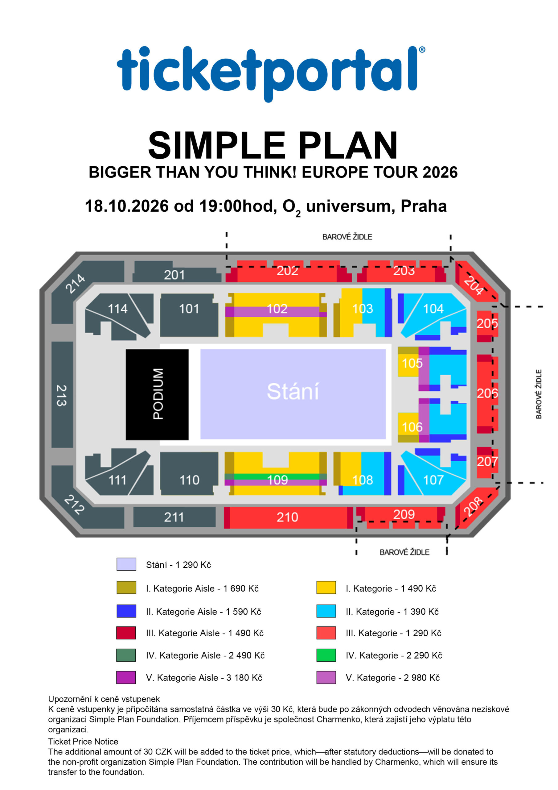 K ceně vstupenky je připočítána samostatná částka ve výši 30 Kč, která bude po zákonných odvodech věnována neziskové organizaci Simple Plan Foundation. Příjemcem příspěvku je společnost Charmenko, která zajistí jeho výplatu této organizaci.